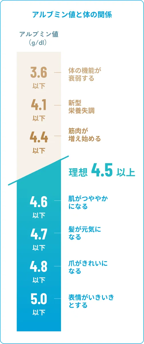 医師が本気で考案したこのプロテインには、単に「飲む」だけでは終わらない工夫があります。それが、肝臓専門医・栗原毅による“摂取目安表”の存在です。アルブミン値をもとに、個人ごとの摂取量の目安を提示し、無理なく、安心して続けられるように設計されています。