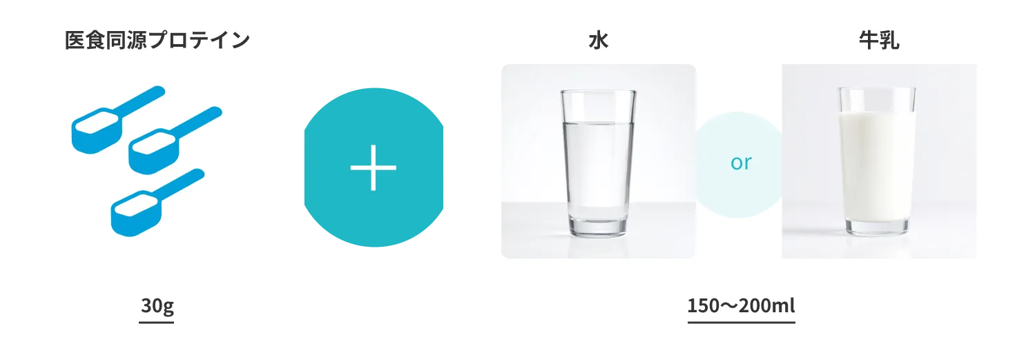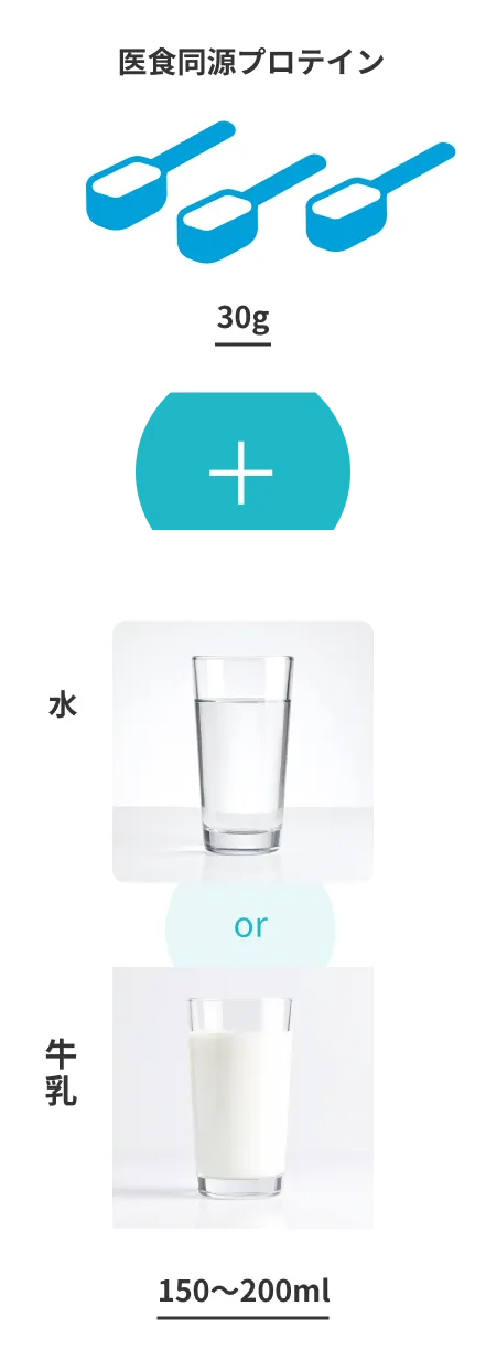 付属の20ccスプーンで約3杯(約30g)を目安に、水または牛乳150ml~200mlに溶かしてお召し上がりください。