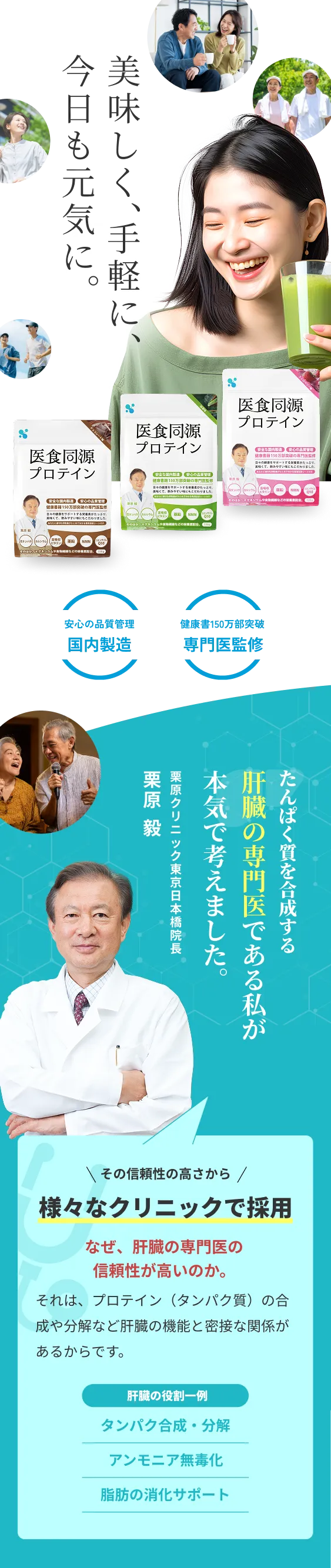 このプロテインは、肝臓専門医が自身の専門知識を活かして、成分の選定から配合比率、飲みやすさに至るまで本気で設計したものです。クリニックでも実際に販売されており、信頼と実績のある製品です。